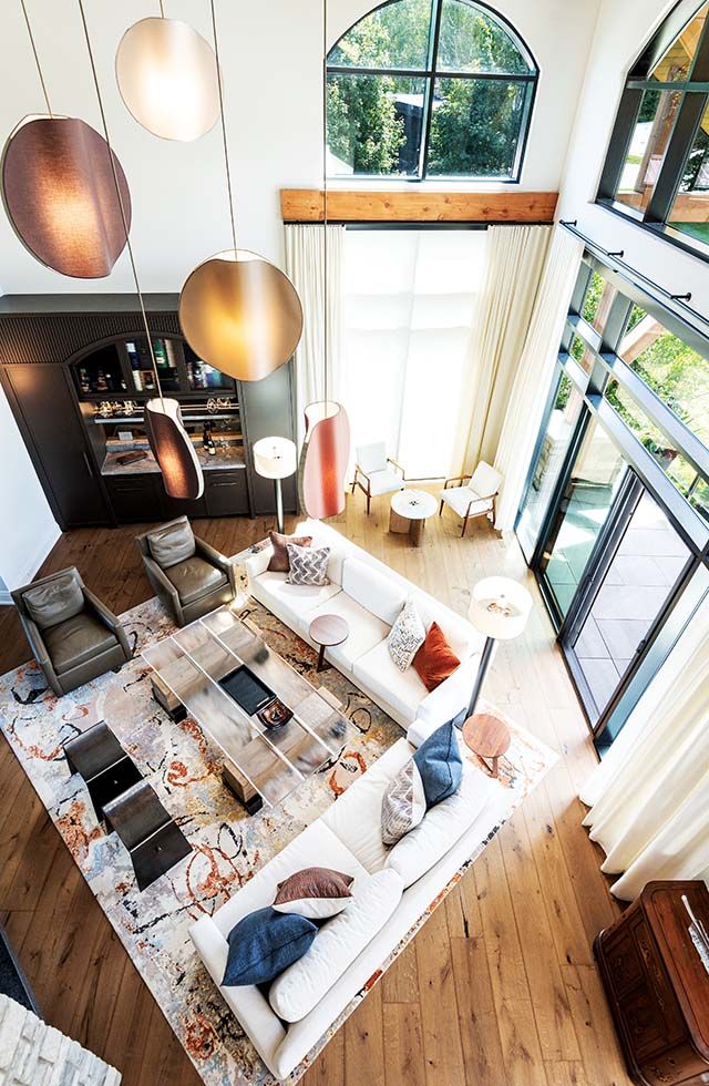 “We decided that instead of going ultra-modern, we would build a true home that was functional and low-maintenance—not overly traditional or woody, but with a ski feel,” said the homeowner. From the front, the home makes a bold alpine statement, with dramatic peaked roofs framed in hand-hewn timber, and expansive floor-to-vaulted-ceiling windows with arched tops that face directly south over the ski runs.