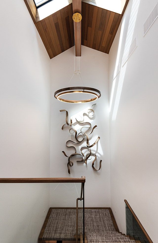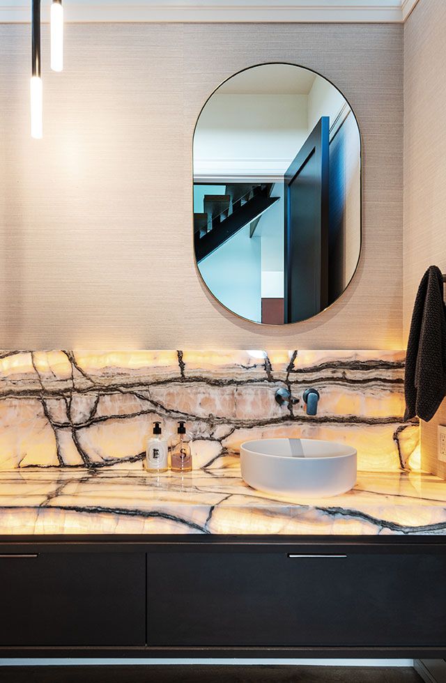 PattyMac Project Manager Alyssa Kirk was responsible for ensuring that the entire project was executed as smoothly and efficiently as possible, prioritizing her clients and their needs every step of the way. She sums up her experience: “Everything in the home was designed with intention. There were many challenges because this home contains a lot of bells and whistles and moving parts,” she said. One of her favourite features of the home is a backlit onyx countertop in the powder room designed by Karen Kayne. “The architecture of Andrew Slade was amazing and everything in the interior is a testament to the talents of designer Karen Kayne. Sitting now in this finished home and looking around, everything I saw on paper has now come to life. It’s pretty wonderful to see.” E