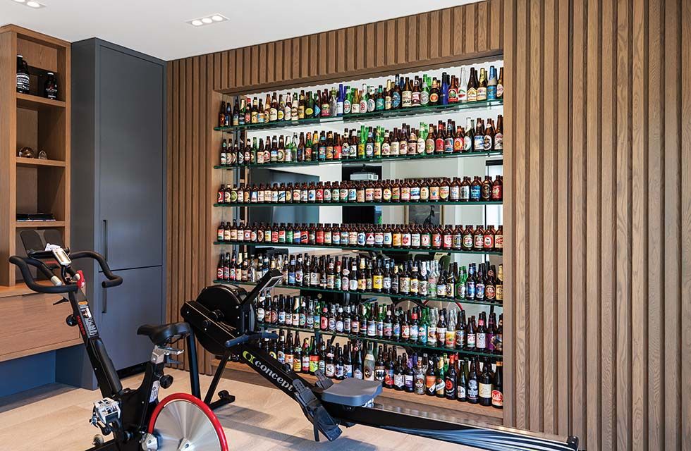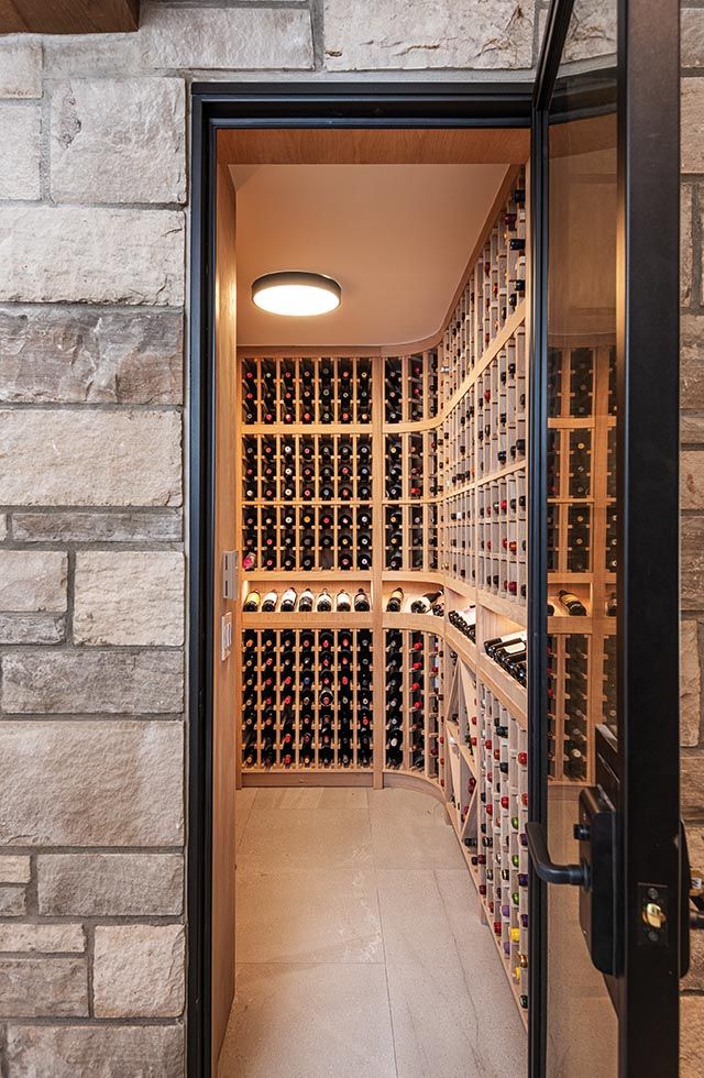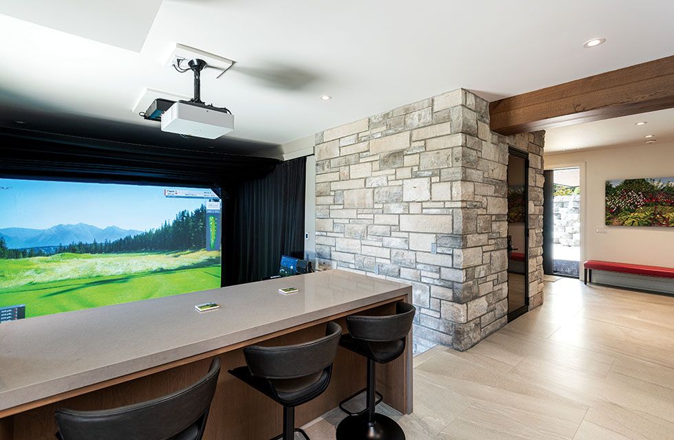 The lower level of the home, in keeping with traditional ski chalet design, is dedicated to fun and enjoyment, including a climate-controlled walk-in wine room, a golf simulator room, and a gym with an entire wall of vintage “stubby” beer bottles. A walkout from this level leads out to a stone-paved patio, swimming pool, hot tub, and a cabana/bar that complements the home’s design.