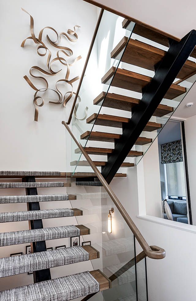 MacDonald describes the chalet as a seamless blend of modern and traditional elements. As an example, he describes another focal point of the great room: a semi-circular cantilevered balcony with radius (curved) glass overlooking the room below and the view south over the slopes from the upper living area. “This was a unique feature—a gorgeous piece of craftsmanship that our crew played a role in creating, including a curved, heated, and bent natural wooden railing,” he said. He also points out another unique feature of the home—a mono stringer-design staircase supported by a large steel beam and embellished with wood details and carpet runners to add warmth, comfort, and safety.