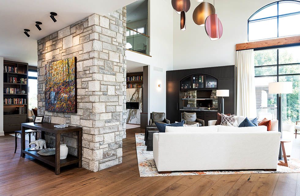 “The steep angled roof over the great room involved intricate framing because of many inverted hips, and various areas required cladding to create beams,” MacDonald added. “Getting to the top of the fireplace to slab the entire length and achieve the desired level of finish with that magnitude took a lot of coordinated effort and a lot of scaffolding, but in the end, everyone was pleased with the result.”