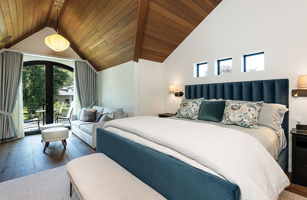 “The traditional elements of the chalet, like its strong gabled roofs, are iconic, but my clients had a preference for a modern aesthetic,” said Andrew Slade. “The homeowners had a great appreciation for modernism, building science and technology, and the kinds of techniques and principles that we use in design to convey a high-tech look with traditional grounding. The main living spaces are situated on the second floor, including a vaulted woodceiling master bedroom that includes a spa-like ensuite and a double glass door opening to a terrace overlooking the ski hill.”