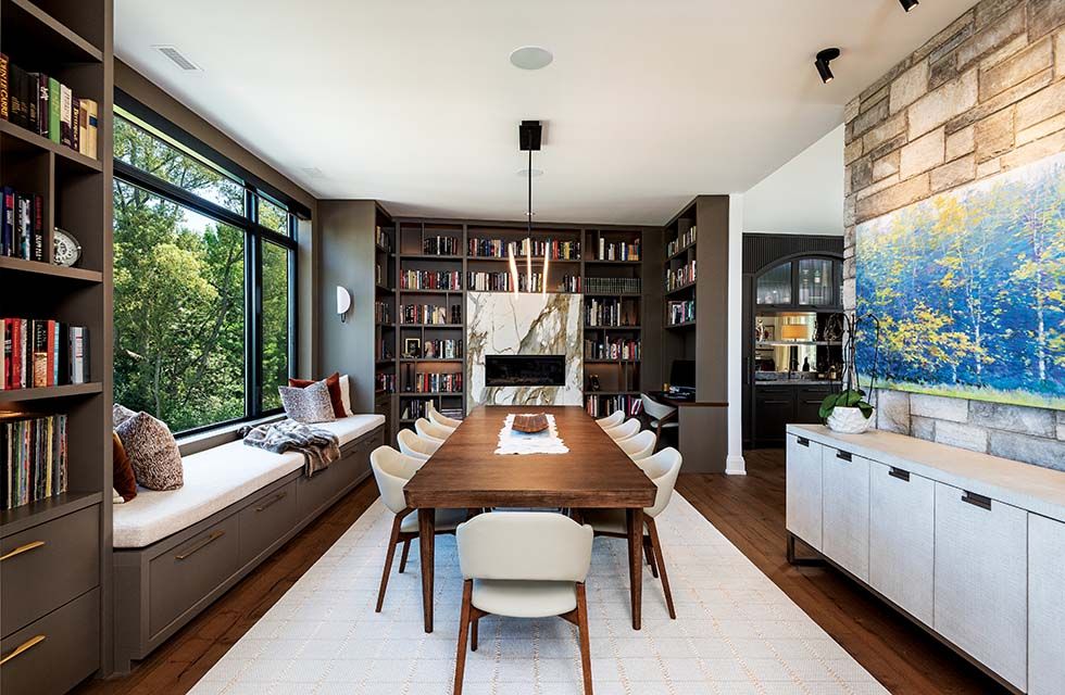 Among the chalet’s many interesting design features, Steve MacDonald credits designer Karen Kayne of Karen Kayne Interior Design Inc., for the chalet’s unique dining room. “This is one of my favourite rooms in the home,” said Kayne. “It’s a warm, eclectic, and inviting double-duty space, with a library at one end, a small workspace beside a picture window overlooking the pool, and a ten-foot window seat.”
