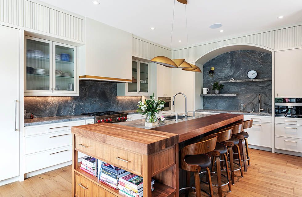 Touring the home, this writer noted that virtually every room features warm oak flooring with light and colourful rugs. “The area rug in the living room was our jumping-off point. It does have a contemporary aesthetic to it, but the sculptural accents also add warmth,” said Kayne. “So, we built the entire room based on the rug. And then, as we moved into the other spaces, we laid out our palette and made sure that the rooms just flowed from one to the next. Similarly, the palette in the kitchen was also the jumping-off point to this space and the bar. We selected the stone first—a waterfall marble countertop in a solid wood island—and went from there.”