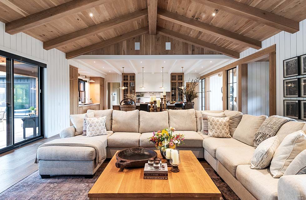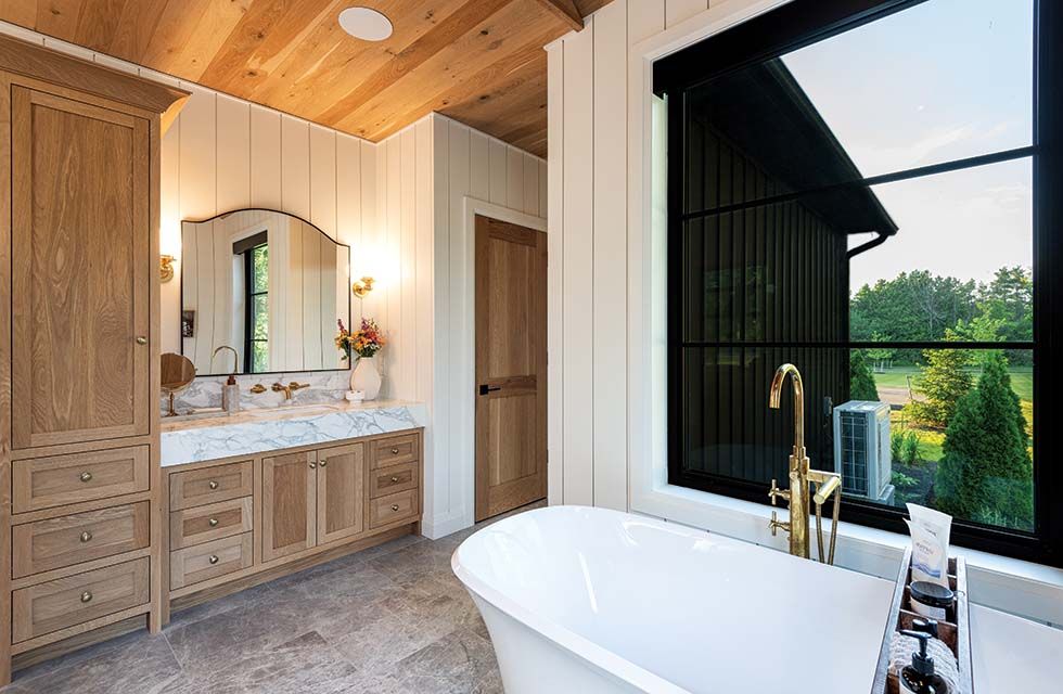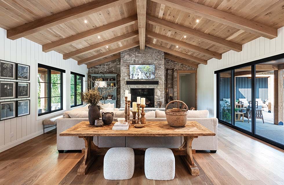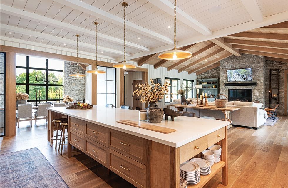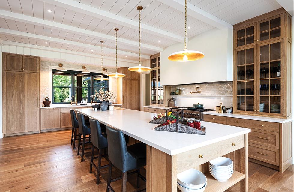 Entering the 5,800-square-foot home, the open-concept design, the natural white oak floors, ceilings and beams, the warm white shiplap on the walls, and the detailed custom millwork create a warm and inviting environment—not rustic, but rural refined. The home is one level with a loft, with no basement except a crawl space, and radiant in-floor heating.