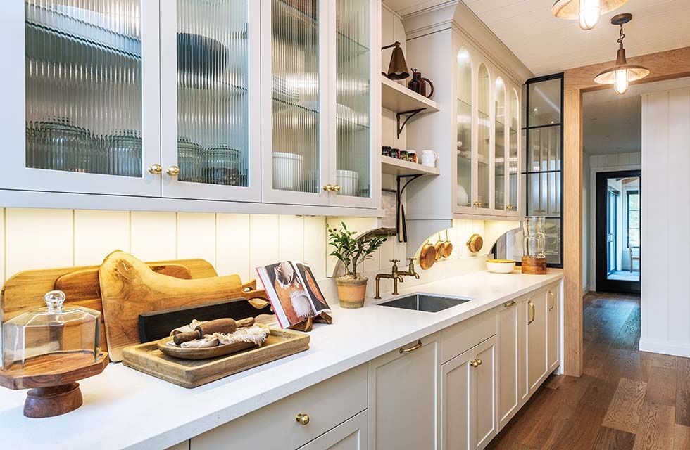 While the aunts took care of the home’s décor, Interiors by AG managed the design of all the cabinetry and millwork, choosing the home’s colours, interior and exterior lighting, flooring and tile. By far, the defining design element in the home is the superb craftsmanship in the millwork—cabinetry, built-ins, wall units and some furniture pieces—crafted by Barber Millwork near Creemore. Established in 2006, the company specializes in high-end custom millwork and cabinetry projects in Southern Georgian Bay.