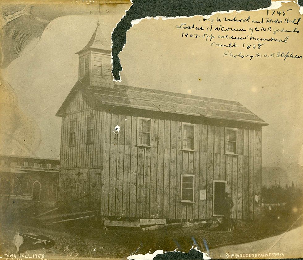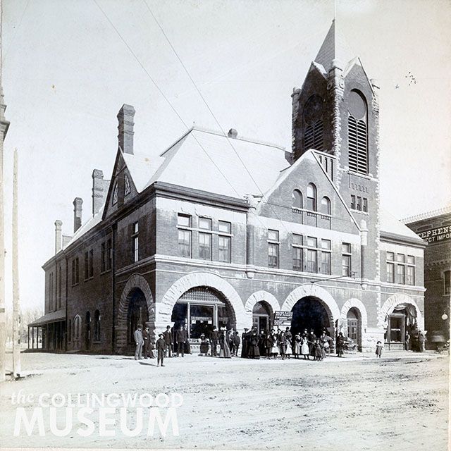 Left: Collingwood’s first town hall, photographed by Dr. A.R. Stephen, from a series documenting early scenes later donated to the Huron Institute. Collingwood Museum Collection, X970.876.1; Huron Institute Collection No. 1745.