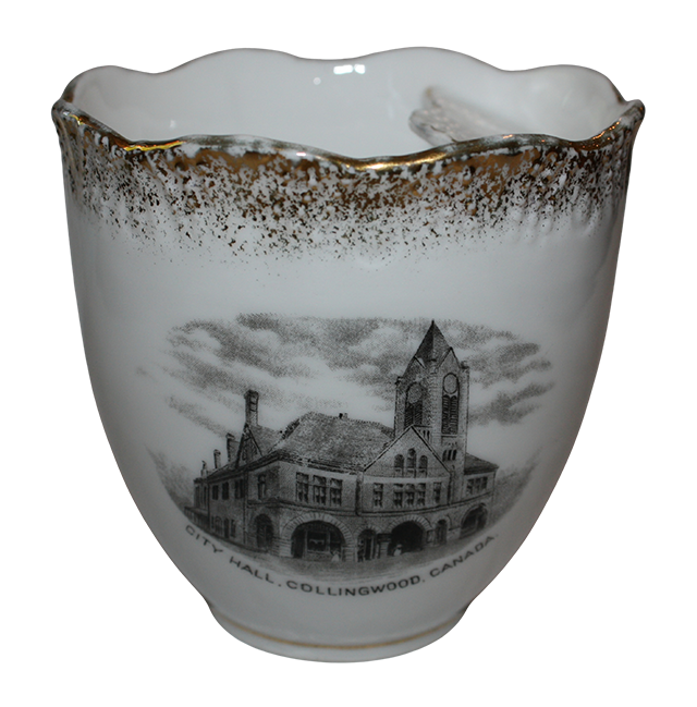 From left: An 1875 lithograph of Collingwood shows the only known depiction of the town’s second hall, a two-storey wooden structure between Hurontario and Ste. Marie Streets. Collingwood Museum submitted photograph. A decorative teacup featuring the current town hall, complete with a built-in mustache guard. Collingwood Museum Collection, X976.123.1a. The first brick town hall, where visible lime mortar washing over the brickwork points to early masonry concerns—believed to be the building destroyed by fire in August 1890. Photograph by James Asa Castor. Collingwood Museum Collection, 007.17.4.