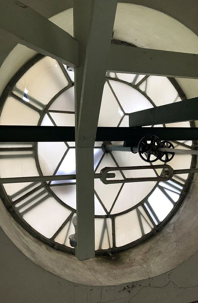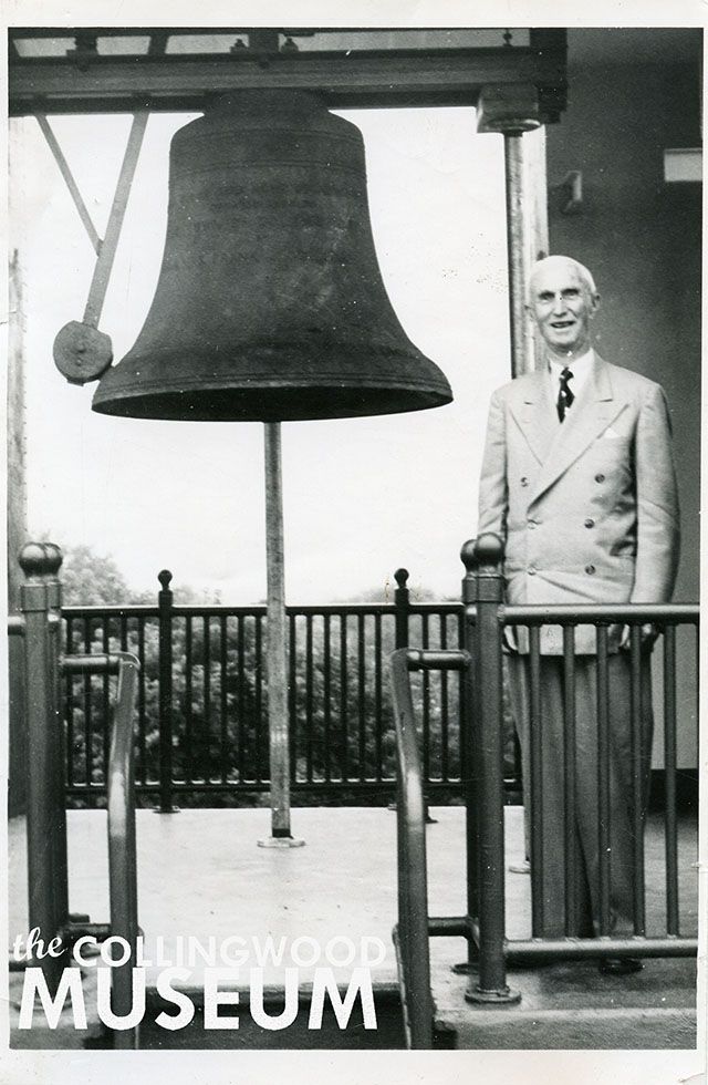 Clockwise from top: Early postcards often show a clock on the town hall tower—but Collingwood’s first and only clock wasn’t installed until 1951, a key detail used by Museum staff to date images. Collingwood Museum Collection, 002.73.1. Inside the clock tower, January 2020, revealing the inner gears. Collingwood Museum submitted photograph. Frank Courtice with the newly donated bell and clock, installed August 5, 1951—after the tower stood empty for 60 years. Collingwood Museum Collection, 002.35.11.