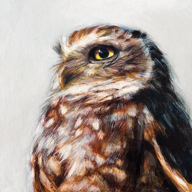 Burrowing Owl, Echoes of The Wild series, oil on wood. 10″ by 10″