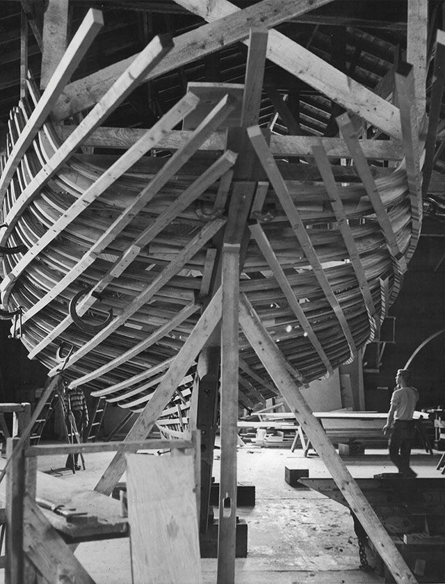 “Cliff had ties to Meaford and Thornbury, so he decided to spend winters here and started to build boats in about 1933. He’d work at his dad’s marina in the summer, build in the winter. His customers then were folks who had summer places around Parry Sound—including families like the Eatons from Toronto and some Americans who came up—and needed power boats; runarounds. Cliff’s mainstays were steel, aluminum, and wood, and he also built for fuel companies like Esso and utility boats during the war. He never did his own line of sailboats, but he worked with other companies to finish a handful of them,” says Laporte.