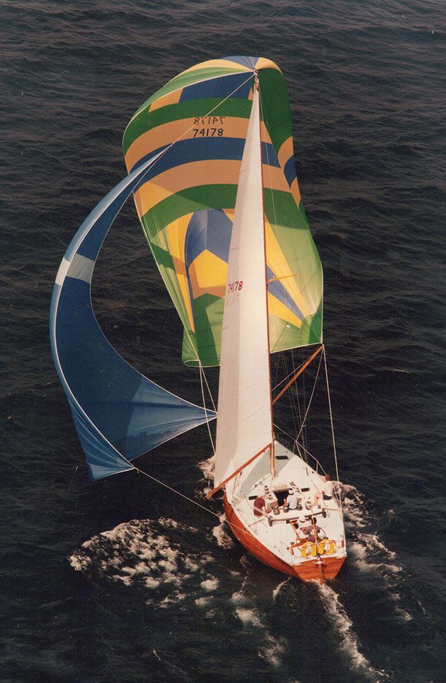 Superior Sailboats were known for custom crafts that often took two or more years to build. One such commission came from Canadian troubadour Gordon Lightfoot, for whom the Carpenters built the 45-foot sloop Golden Goose. The duo’s masterpiece, however, was arguably Passing Wind, a 62-foot cruiser. The U.S. magazine Artful Living described it: “The one-piece solid slab doors of Honduran mahogany and beautiful inlay work on the counters, tables, and transom are worthy of any art gallery. The boat is built entirely of wood, with one-inch-thick decking constructed from three layers of laminated red cedar and mahogany. Custom hardware and fine leathercovered settees and cushions speak to the owner’s wish to have a competitive ocean racing yacht with sumptuous yet practical accommodations. Passing Wind is spectacular in all facets.”