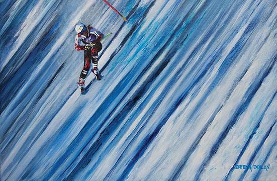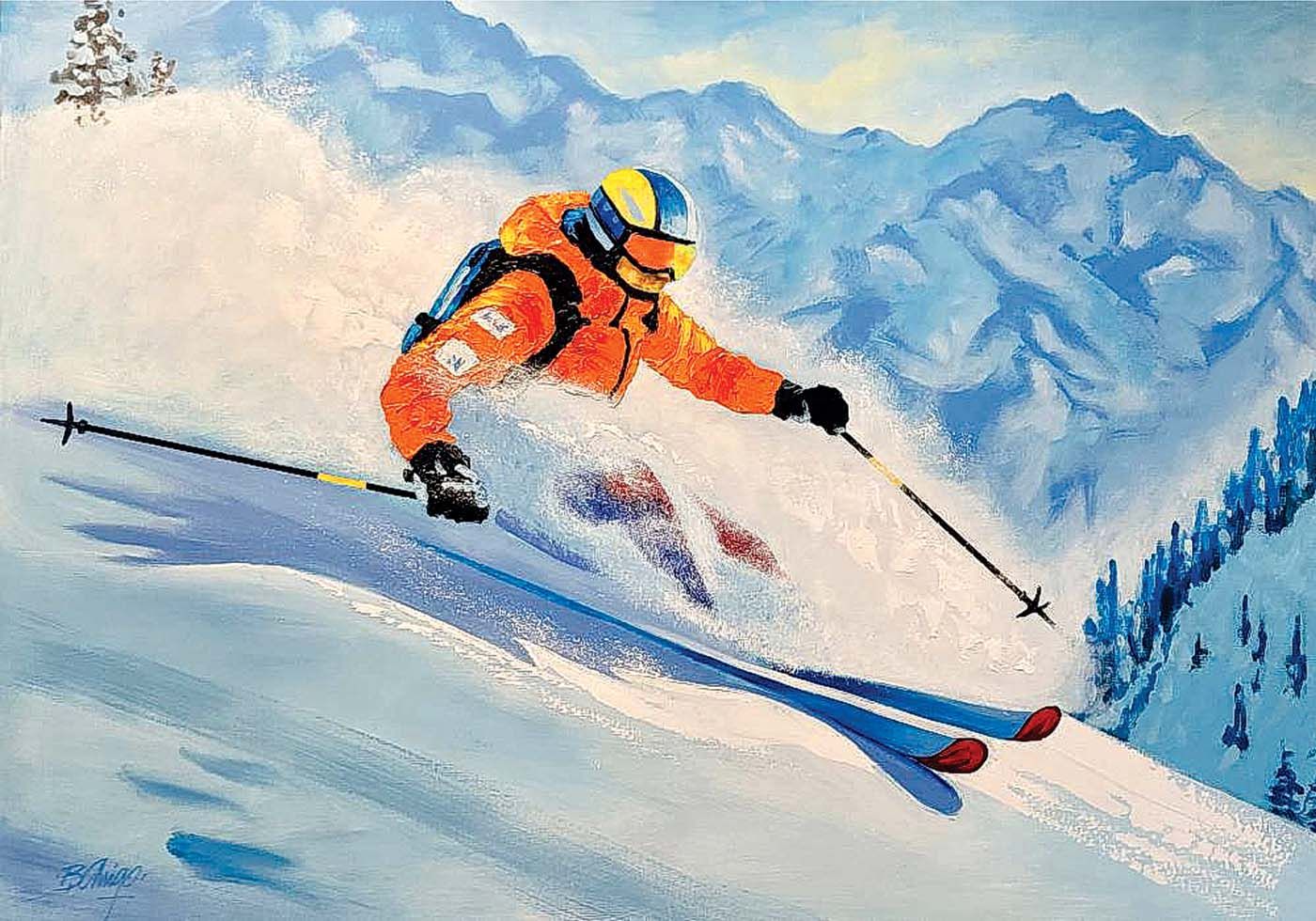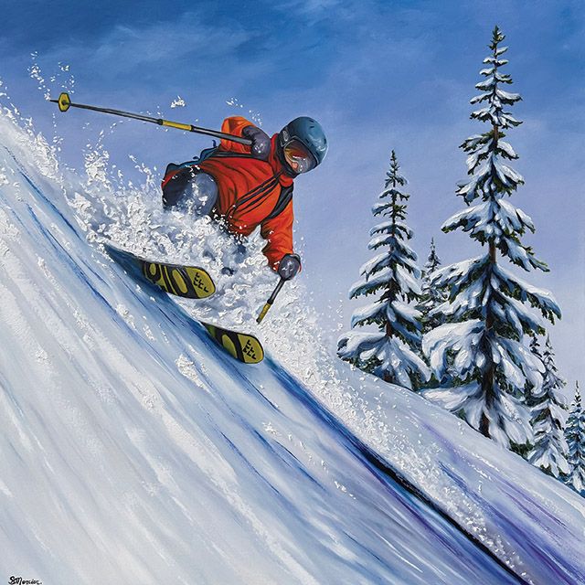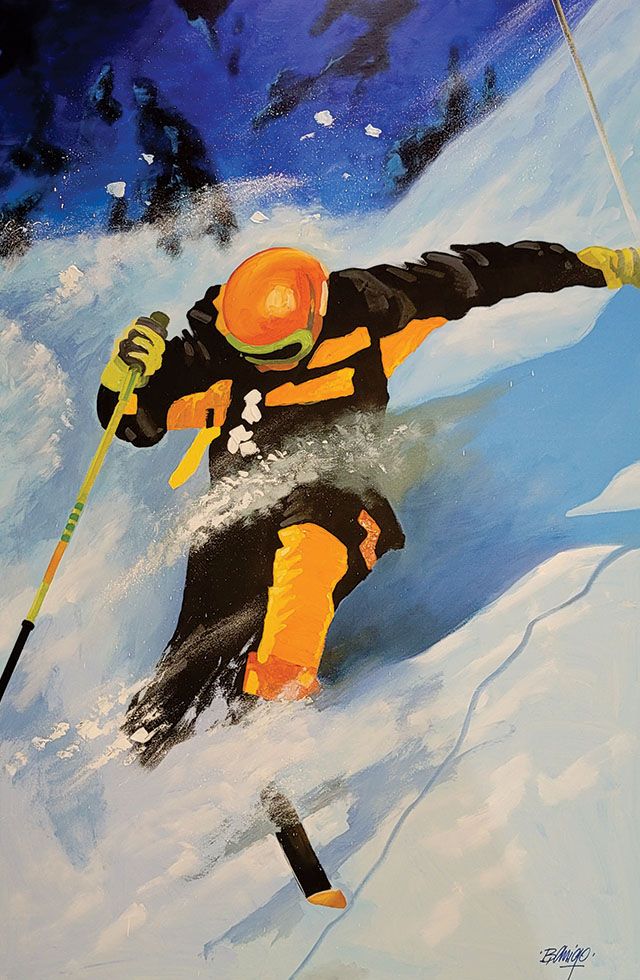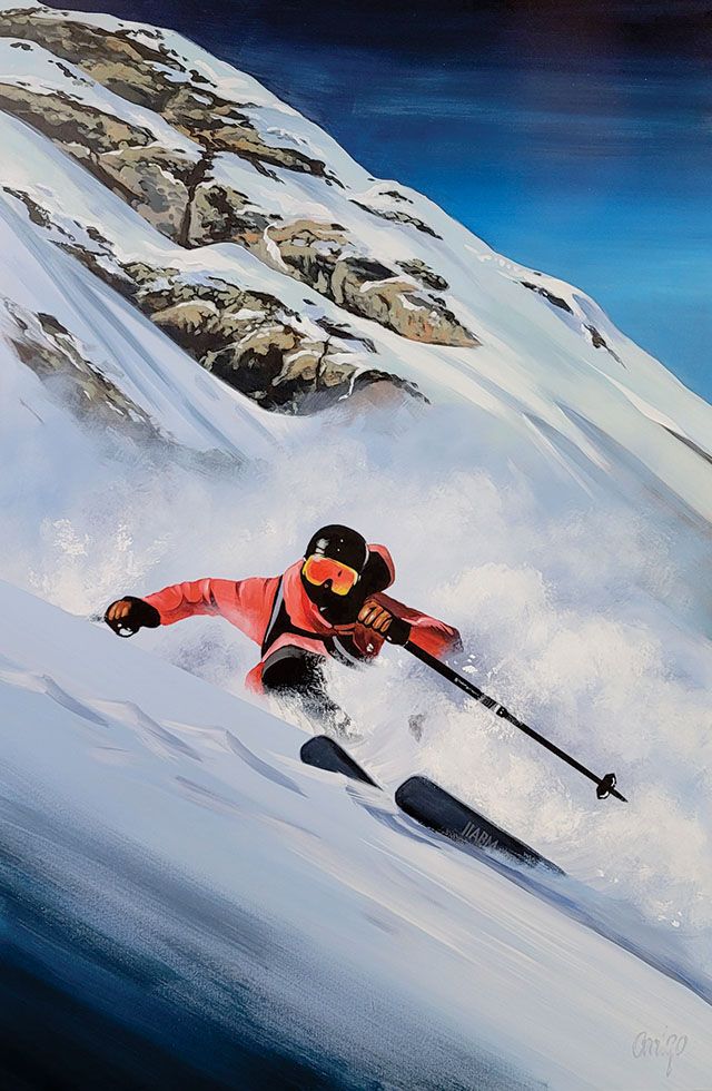 He hopes his art reminds viewers of “the thrill and excitement of getting out on the slopes… that feeling of flying into freedom while speeding through white.” bobarrigo.com