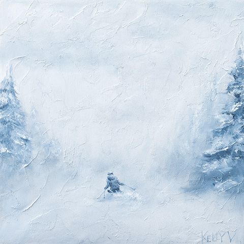 Winter, she says, holds a special pull. “It has this amazing mix of energy and calm—that quiet thrill you get when carving through snow or just standing still in it.” Whether depicting skiers in motion or the stillness of a snowy forest, her paintings explore the balance between excitement and serenity, between movement and presence.