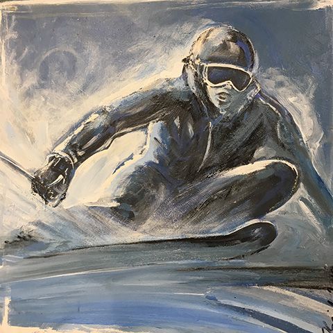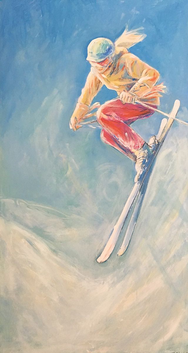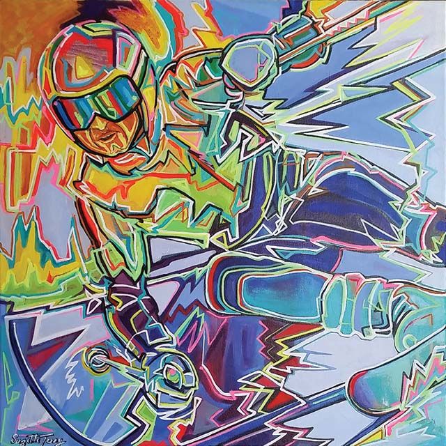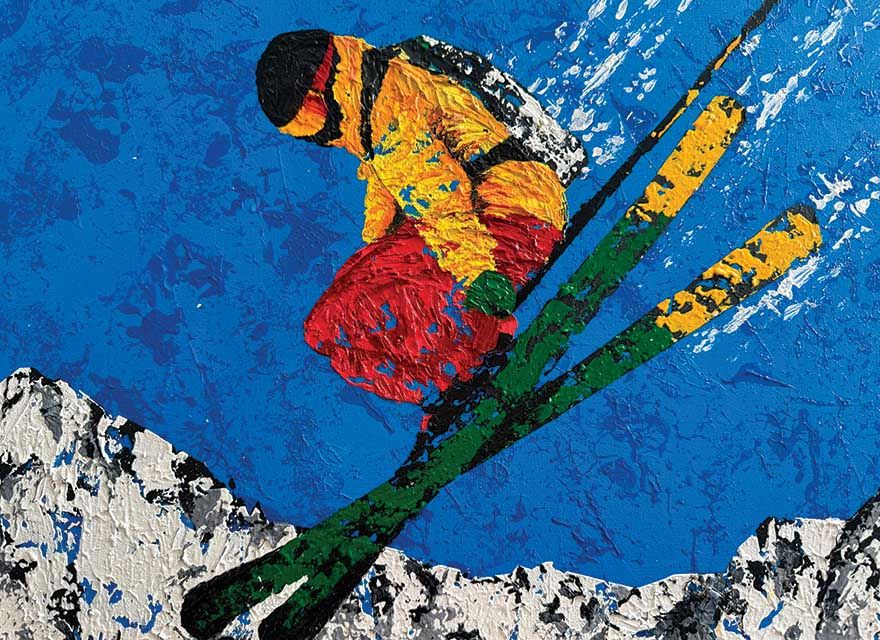 Colour, texture, and momentum define Suzette Terry’s vibrant ski scenes. Working in acrylic and collage, her compositions are alive with swift, expressive lines and high-intensity colour. A skier herself, Terry channels the adrenaline of the slopes into every piece.