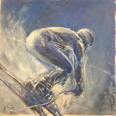 Loose, impressionistic, and full of freedom, Bob Arrigo’s “Extreme Skiers” series captures the pure exhilaration of motion. Painted exclusively in acrylics and thickeners, his works pulse with colour and texture—the visual echo of carving turns through fresh powder.